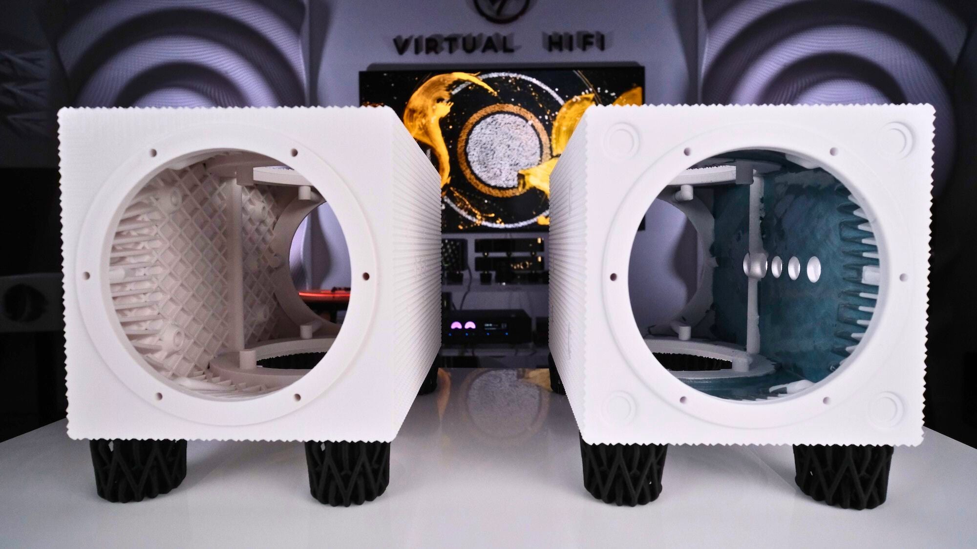 Thanks to the 5 mm PETG shell combined with a 5 mm internal diamond-brace grid filled with 35A elastomer loaded with stainless steel micro-particles, the Cobra enclosure is over 10× more effective at suppressing vibration than a traditional 22 mm MDF cabinet. It also preserves almost 20% more internal volume, allowing deeper bass and greater output from the same footprint. The box disappears — only the music remains.